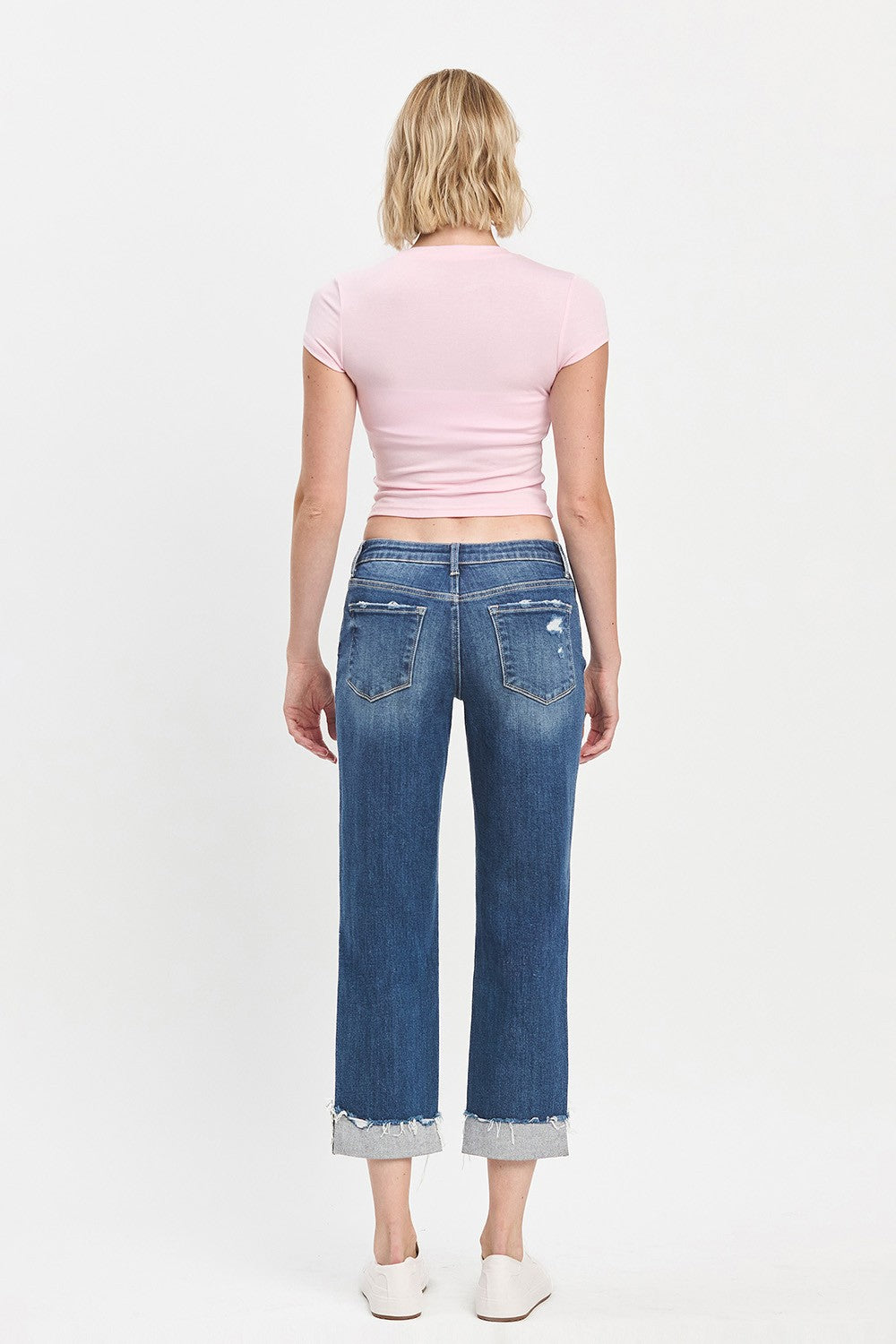 MID RISE CUFFED BOYFRIEND JEANS COMFORT STRETCH DENIM, MID RISE WAIST, SLIGHTLY DISTRESSED DETAIL, SINGLE CUFF HEM, CROPPED LENGTH, BOYFRIEND JEANS